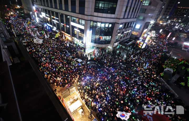 [서울=뉴시스] 홍효식 기자 = 9일 서울 여의도 국민의힘 당사 앞에서 시민들이 윤석열 대통령 탄핵과 국민의힘 해체를 촉구하고 있다. 2024.12.09. [email protected]