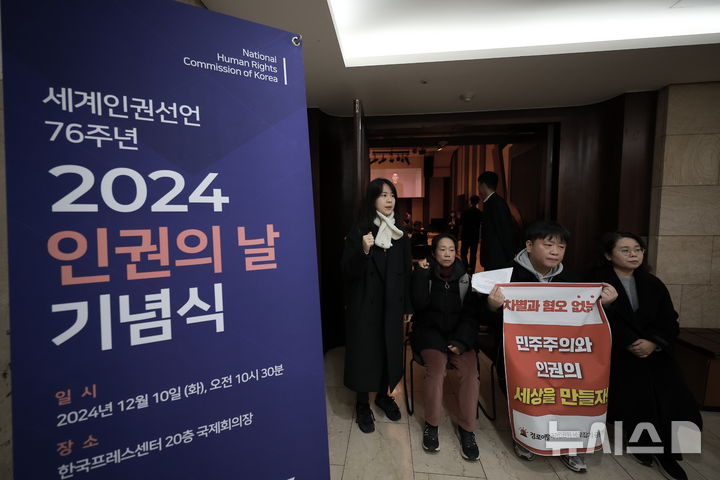 [서울=뉴시스] 정병혁 기자 = 10일 서울 중구 한국프레스센터에서 열린 2024 인권의날 기념식장 앞에서 국가인권위원회 바로잡기 공동행동 회원들이 비상계엄에 침묵하는 안창호 국가인권위원장 퇴진 요구 기자회견을 마친 뒤 행사장 입구를 막아서고 있다. 2024.12.10. [email protected]