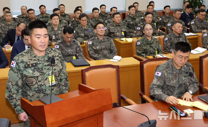 [서울=뉴시스] 조성우 기자 = 김현태 707특수임무단장이 10일 오전 서울 여의도 국회에서 열린 국방위원회의 긴급 현안질의에서 의원 질의에 답변하고 있다. 오른쪽은 박안수 육군참모총장. 2024.12.10. [email protected]