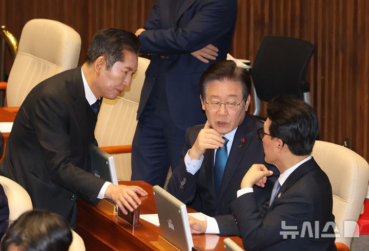 [서울=뉴시스] 고승민 기자 = 이재명 더불어민주당 대표와 정청래 법사위원장, 김민석 최고위원이 10일 서울 여의도 국회에서 열린 제418회국회(정기회) 제18차 본회의에서 대화하고 있다. 2024.12.10. [email protected]
