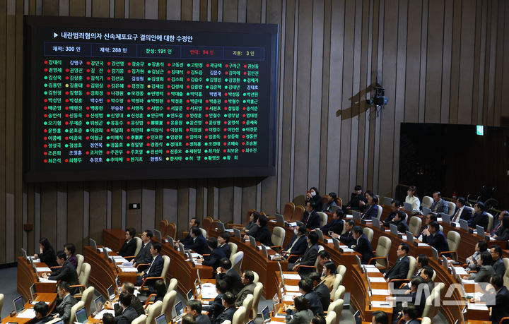 [서울=뉴시스] 고승민 기자 = 10일 서울 여의도 국회에서 열린 제418회국회(정기회) 제18차 본회의에서 내란범죄혐의자 신속체포 요구 결의안에 대한 수정안이 재석 288인, 찬성 191인, 반대 94인, 기권 3인으로 가결되고 있다. 2024.12.10. [email protected]