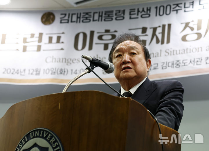 [서울=뉴시스] 이영환 기자 = 정대철 헌정회장이 10일 오후 서울 마포구 연세대학교 김대중도서관에서 열린 김대중대통령 탄생 100주년 노벨평화상 수상 24주년 기념식 및 기념강연에 참석해 축사를 하고 있다. 2024.12.10. [email protected]