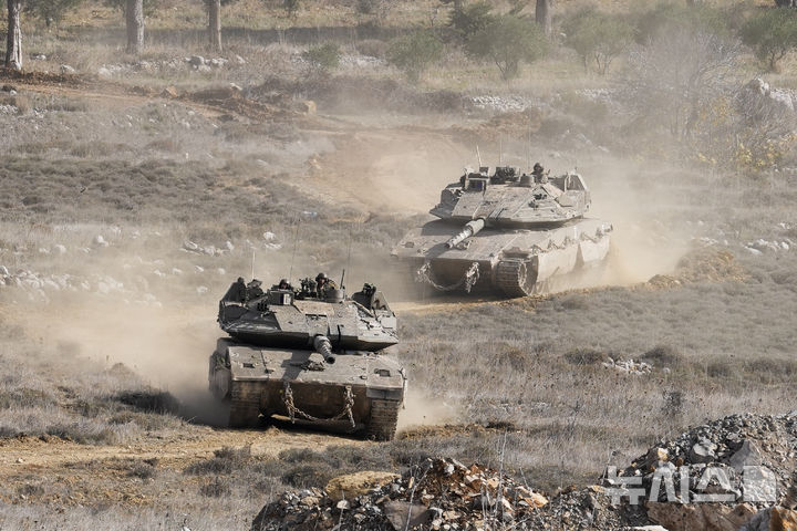 [마즈달 샴스=AP/뉴시스] 11일(현지시각) 이스라엘군 전차들이 골란고원 마즈달 샴스 마을의 '알파 라인' 인근에서 기동하고 있다. 이스라엘은 1967년 2차 중동전쟁 시 시리아로부터 골란고원을 탈취했으며 1973년 3차 전쟁 때 시리아를 재차 물리쳤다. 1974년 휴전 합의로 골란고원 아래쪽에 양국 간 경계선인 '알파 라인'을 설정하고 이를 중심으로 비무장 완충지대를 조성했다. 2024.12.12.