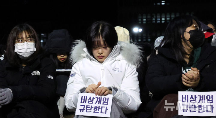 [서울=뉴시스] 추상철 기자 = 12일 오후 서울 마포구 연세대학교에서 열린 '윤석열 대통령의 비상계엄 선포에 따른 학생총회 및 연세인 시국선언대회'에서 참가한 학생이 피켓을 들고 있다. 2024.12.12. [email protected]
