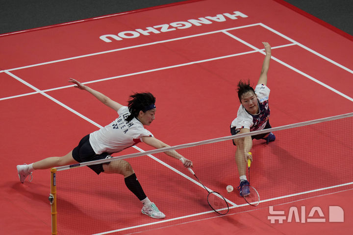 [항저우=AP/뉴시스] 백하나-이소희 조(2위)가 12일(현지시각) 중국 항저우에서 열린 세계배드민턴연맹(BWF) HSBC 월드투어 파이널스 여자 복식 조별리그 B조 2차전에서 천칭천-자이판 조(3위·중국)와 경기하고 있다. 백하나-이소희가 0-2(16-21 16-21)로 패해 1승 1패를 기록했다. 2024.12.13.