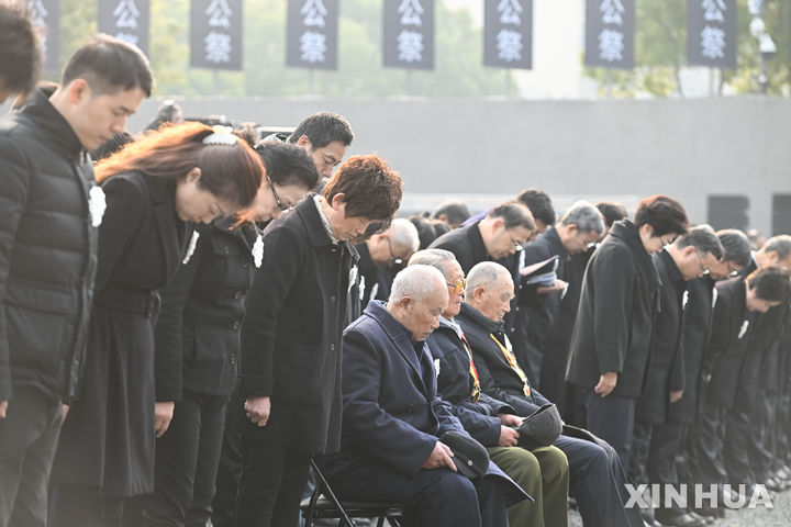 [난징=신화/뉴시스] 13일(현지시각) 중국 장쑤성 난징에서 제11회 난징대학살 희생자 추모식이 열려 참석자들이 희생자들을 위해 묵념하고 있다. 난징대학살은 1937년 중일전쟁 당시 일본군이 난징에 진입해 중국군 패잔병과 무고한 민간인 등 30만 명 이상을 살해한 사건으로 중국 정부는 2014년, 12월 13일을 난징대학살 희생자 국가추모일로 제정했다. 2024.12.13.