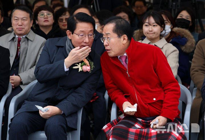[대구=뉴시스] 이무열 기자 = 김상훈 국민의힘 정책위의장과 홍준표 대구시장이 13일 오전 대구 서대구역 중앙광장에서 열린 대경선 광역철도 개통식에서 대화하고 있다. 2024.12.13. [email protected]