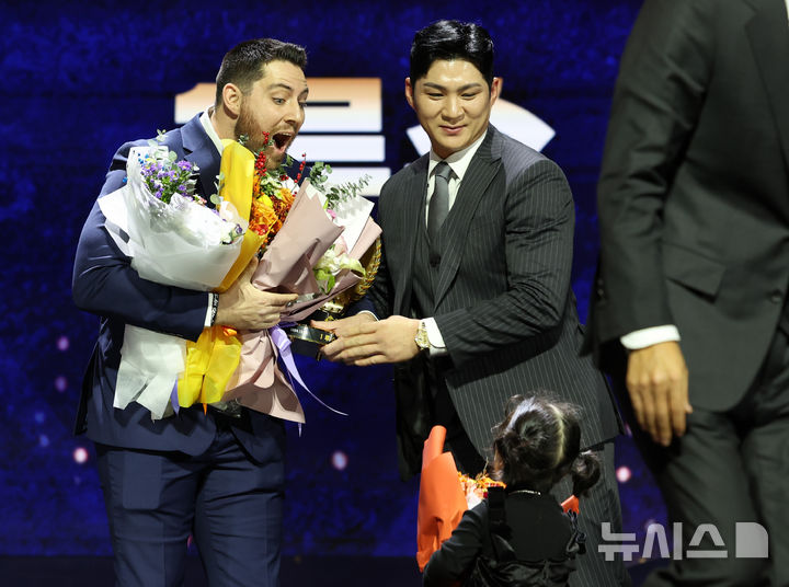 [서울=뉴시스] 이영환 기자 = LG 트윈스 오스틴이 13일 오후 서울 강남구 코엑스 오디토리움에서 열린 2024 KBO 골든글러브 시상식에서 1루수 부문 골든글러브를 수상하자 동료 오지환, 박동원의 딸에게 꽃다발을 받고 있다. 2024.12.13. [email protected]