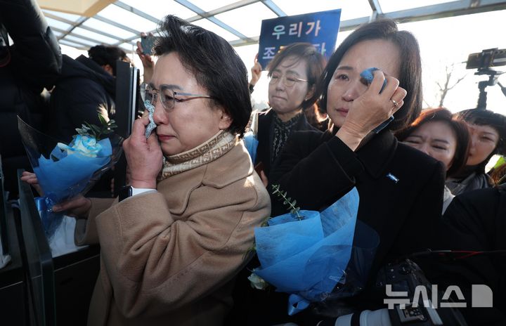 [의왕=뉴시스] 홍효식 기자 = 자녀 입시비리 혐의 등으로 징역형이 확정돼 수감되는 조국 전 조국혁신당 대표가 16일 오전 경기도 의왕시 서울구치소로 출석하자 김선민 조국혁신당 대표 권한대행 등이 눈물을 흘리고 있다. 2024.12.16. [email protected]