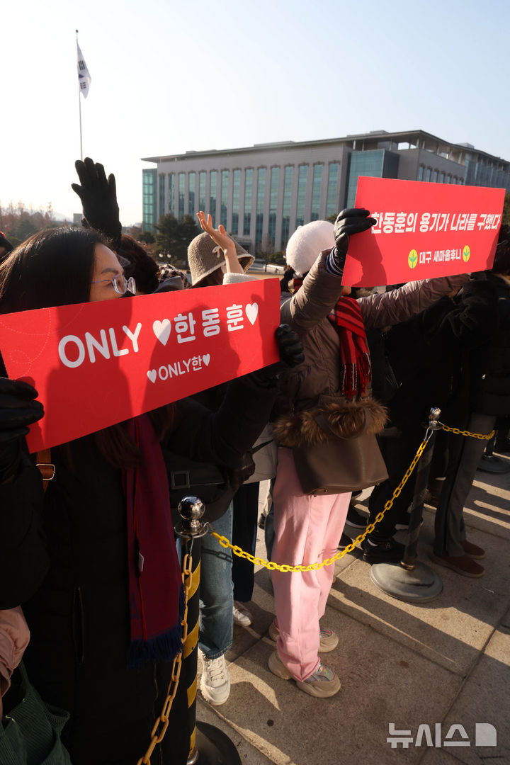 [서울=뉴시스] 조성봉 기자 = 한동훈 국민의힘 대표의 거취 관련 기자회견이 예고된 16일 오전 서울 여의도 국회 본청 앞에서 한 대표의 지지자들이 응원을 하고 있다.2024.12.16. [email protected]