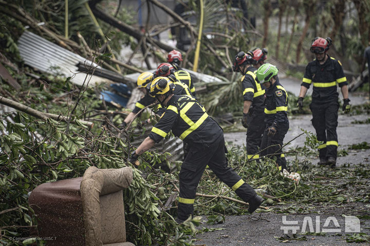 [마요트=AP/뉴시스] 16일(현지시각) 아프리카 동남부 인도양에 있는 프랑스령 마요트섬에서 구조대원들이 사이클론 '치도'로 피해를 본 거리를 정리하고 있다. 지난 14일 '치도'가 마요트섬을 관통하면서 피해를 본 섬 주민들은 “종말 같았다" "동네가 사라지는 걸 봤다" 등의 목격담을 전했다. 2024.12.17.