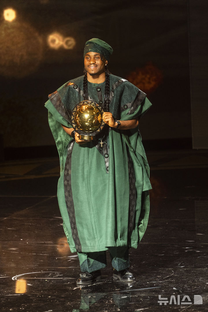 [마라케시=AP/뉴시스] 아데몰라 루크먼(나이지리아)이 16일(현지시각) 모로코 마라케시에서 열린 아프리카축구연맹(CAF) 시상식에서 '올해의 선수' 상을 받은 후 포즈를 취하고 있다. 2024.12.17.