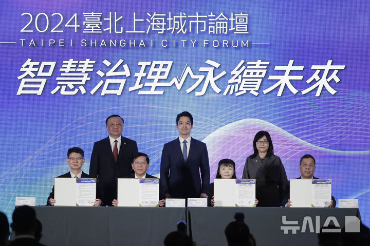 [타이베이=AP/뉴시스] 17일(현지시각) 대만 타이베이에서 타이베이-상하이 포럼이 열려 장완안(가운데) 타이베이 시장이 화위안(왼쪽) 상하이 부시장과 양해각서 서명을 마친 후 기념 촬영을 하고 있다. 화위안 부시장이 이끄는 중국 대표단은 2010년 시작된 연례 타이베이-상하이 포럼 참석을 위해 전날 대만을 방문했다. 2024.12.17.