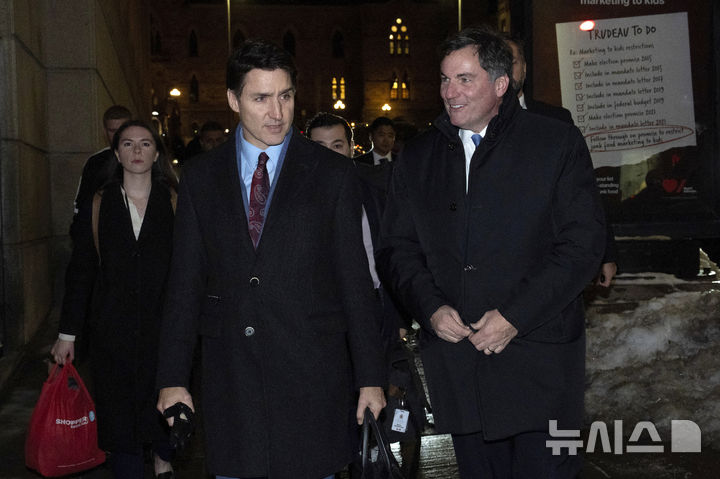[오타와(캐나다)=AP/뉴시스]쥐스탱 트뤼도 캐나다 총리(왼쪽)가 16일(현지시각) 사임한 크리스티아 프리랜드 재무장관의 후임으로 임명한 도미니크 르블랑과 함께 오타와에서 열리는 자유당 전국 코커스 회의장으로 향하고 있다. 프리랜드의 사임으로 위기를 맞은 트뤼도 총리가 사임을 고려하고 있다고 캐나다 방송 CTV 뉴스가 전했다. 2024.12.17.