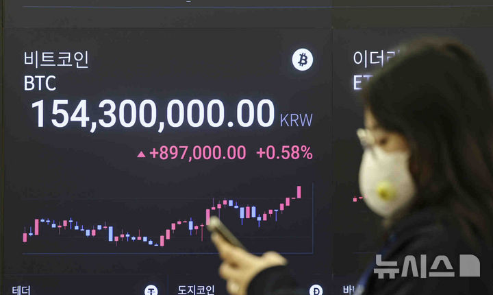 [서울=뉴시스] 김근수 기자 = 가상화폐 비트코인이 하루 만에 사상 최고가 경신해 한때 10만7천800달러대 기록한 17일 오전 서울 강남구 가상화폐 거래소 업비트 고객센터 전광판에 비트코인 거래 가격이 나오고 있다. 2024.12.17. [email protected]