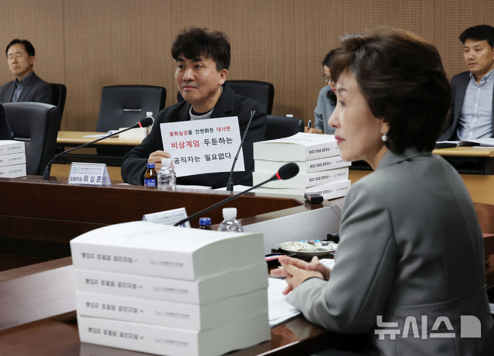 [서울=뉴시스] 김진아 기자 = 17일 서울 중구 진실·화해를위한과거사정리위원회에서 열린 제93차 위원회에서 이상훈 상임위원이 박선영 진실화해위원장에게 비상계엄 관련 손팻말을 들어보이고 있다. 2024.12.17. [email protected]