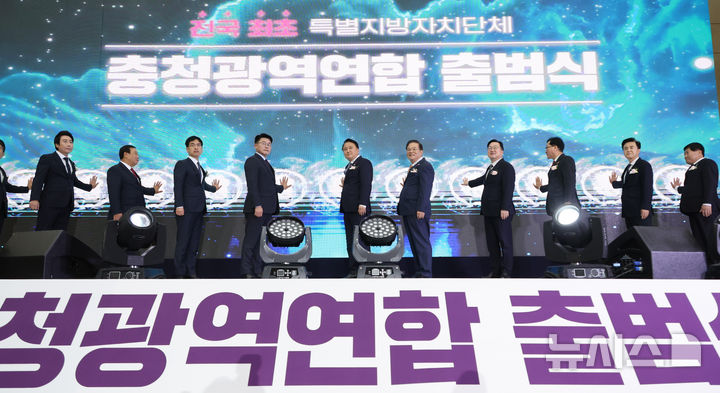 [세종=뉴시스] 강종민 기자 = 김영환 초대 충청광역연합장(충북지사)과 우동기 지방시대위원장, 김민재 행정안전부 차관보, 김태흠 충남도지사, 이장우 대전시장, 노금식 초대 연합의회 의장(충북도의원), 최민호 세종시장 등이 8일 세종시 어진동 정부세종컨벤션센터에서 열린 충청광역연합 출범식에서 출범 퍼포먼스를 하고 있다. 2024.12.18. [email protected]