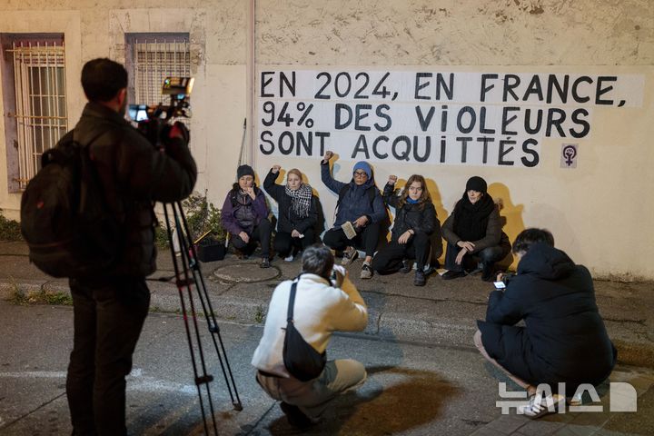 [아비뇽=AP/뉴시스] 프랑스 페미니스트 단체 회원들이 18일(현지시각) 프랑스 아비뇽의 법원 주변에서 성폭행 피해자 지젤 펠리코(72)를 지지하며 "올해 프랑스 성폭행범 94%가 무죄 판결"이라는 글을 붙인 후 구호를 외치고 있다. 지젤의 남편 도미니크 펠리코는 지난 2011년 7월부터 2020년 10월까지 아내의 술잔에 진정제와 수면제 등을 넣어 의식을 잃게 한 뒤 온라인상에서 모집한 익명의 남성 50여 명을 집으로 불러들여 아내를 성폭행하게 한 혐의로 기소됐다. 지젤은 "부끄러움은 피해자가 아닌 피고인들 몫"이라고 주장하며 자신의 얼굴을 드러내고 지난 수 주간 공개 재판을 이어왔다. 2024.12.19.