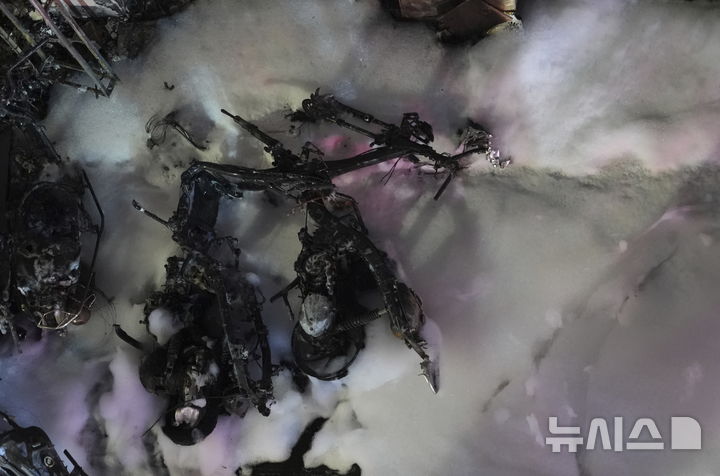 [하노이=AP/뉴시스] 18일(현지시각) 베트남 하노이의 찻집에서 화재가 발생해 현장에 불에 탄 오토바이 잔해가 남아 있다. 현지 경찰은 방화로 인한 화재로 최소 11명이 숨지고 방화 용의자는 체포됐다고 밝혔다. 용의자는 직원과 다툼 끝에 불을 지른 것으로 알려졌다. 2024.12.19.