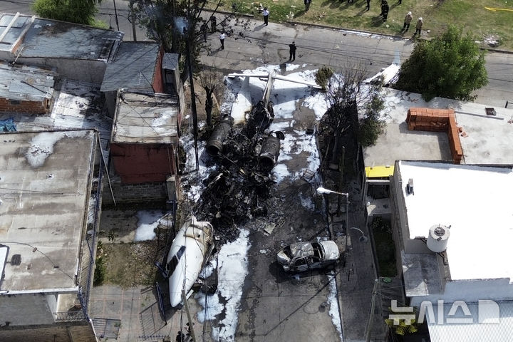 [부에노스아이레스=AP/뉴시스] 18일(현지시각) 아르헨티나 부에노스아이레스 산 페르난도 국제공항에 착륙하려던 개인 비행기가 활주로를 벗어나 인근 가옥에 충돌한 후 잔해만 남아 있다. 현지 당국에 따르면, 항공기는 브레이크 고장으로 주택가로 돌진해 폭발했으며, 조종사와 부조종사가 숨졌다. 2024.12.19.