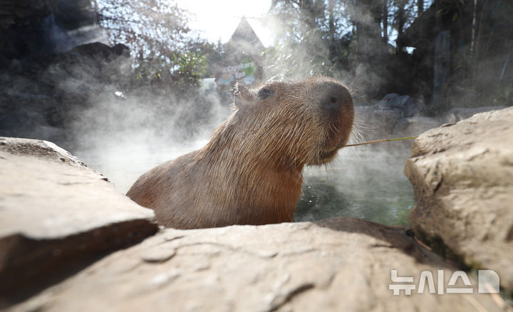 [용인=뉴시스] 김진아 기자 = 동지(冬至)를 이틀 앞둔 19일 경기도 용인시 에버랜드에서 카피바라가 온천욕을 즐기며 먹이를 먹고 있다. 2024.12.19. [email protected]