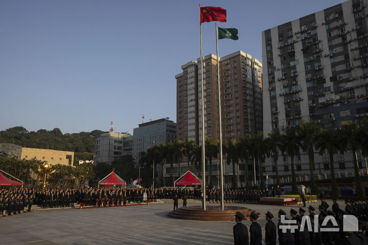 [마카오=AP/뉴시스] 20일(현지시각) 마카오의 중국 반환 25주년을 기념해 국기 게양식이 열린 후 황금연꽃 광장에 중국 국기와 마카오 깃발이 펄럭이고 있다. 마카오는 1887년 중국과 포르투갈이 우호 통상 조약을 체결해 포르투갈이 통치한 지 112년 만인 2019년 12월 20일 중국에 반환됐다. 2024.12.20.