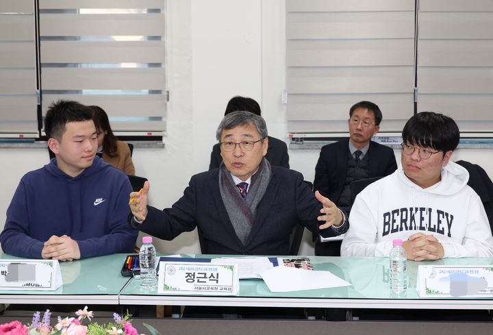 [서울=뉴시스] 김선웅 기자 = 정근식 서울시교육감이 24일 서울 종로구 서울과학고등학교를 방문해 국제올림피아드 수상 학생, 학부모, 교직원과 서울과학영재교육 현황 공유 및 발전 방향을 모색하는 간담회를 하고 있다. (사진=서울시교육청 제공) 2024.12.24. [email protected] *재판매 및 DB 금지