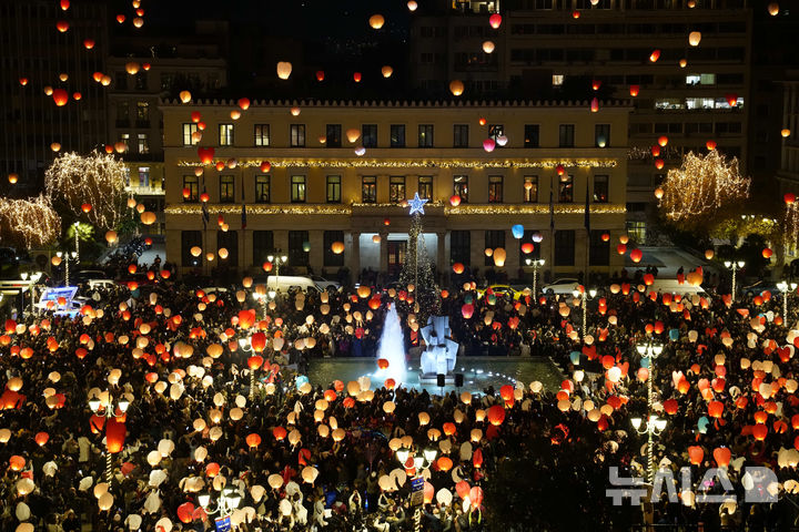 [아테네=AP/뉴시스] 24일(현지시각) 그리스 아테네 시청 앞 코치아 광장에서 아테네시가 주최한 연례 '소망의 밤' 행사가 열려 참가자들이 풍등을 띄우고 있다. '소망의 밤' 행사는 매년 성탄절 전야에 열리는 행사로, 참가자들은 새로운 희망과 소원을 풍등에 실어 날린다. 2024.12.25.