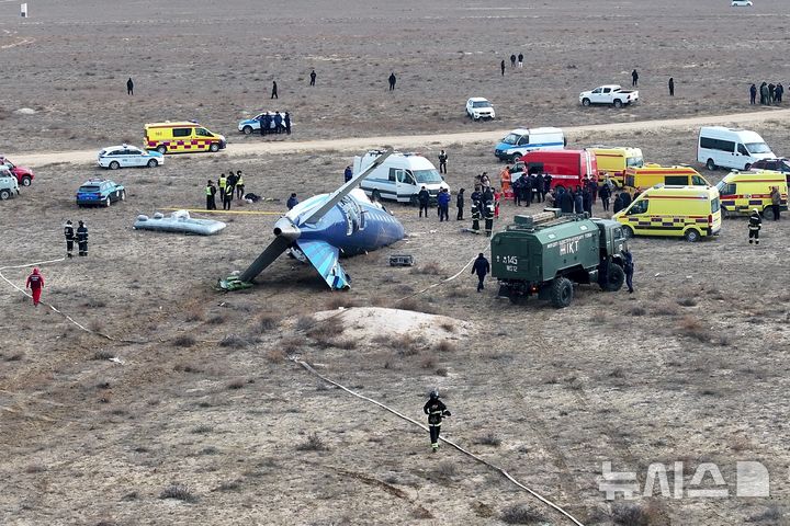 [악타우=AP/뉴시스] 아제르바이잔 수도 바쿠에서 체첸공화국 그로즈니로 가던 엠브라에르 190 아제르바이잔항공 여객기가 25일(현지시각) 카자흐스탄 악타우시 인근에 추락, 사고기 잔해가 흩어져 있다. 2024.12.25.