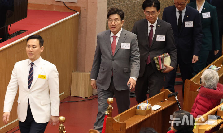 [서울=뉴시스] 추상철 기자 = 권성동 국민의힘 당대표 권한대행 겸 원내대표가 25일 오전 서울 영등포구 여의도 순복음교회에서 열린 성탄예배에 참석하고 있다. 2024.12.25. [email protected]