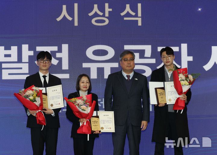 [서울=뉴시스] 고범준 기자 = 엄성복(오른쪽 두번째) 자동차안전연구원장이 26일 서울 용산구 나인트리 프리미어 로카우스 호텔 서울 용산에서 열린 2024 자동차안전도평가 컨퍼런스 시상식에서 기술발전 유공자 시상을 마치고 기념촬영을 하고 있다. 왼쪽부터 메르세데스 벤츠 안찬혁, 현대자동차 김선예, 충북대학교 정승우. 2024.12.26. [email protected]