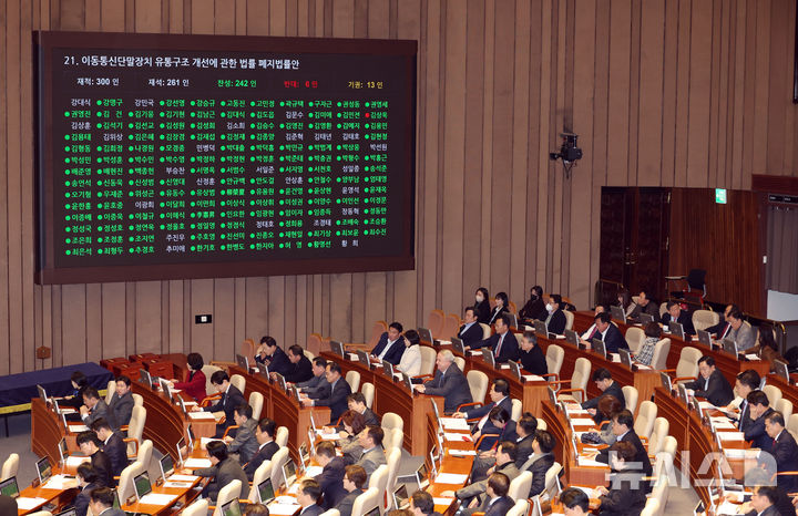 구입부담이 커지고 있다는 비판이 제기되고 있어 이를 폐지하는 이동통신단말장치 유통구조 개선에 관한 법률 폐지법률안이 재석 261인, 찬성 242인, 반대 6인, 기권 13인으로 가결되고 있다. 2024.12.26. [email protected]