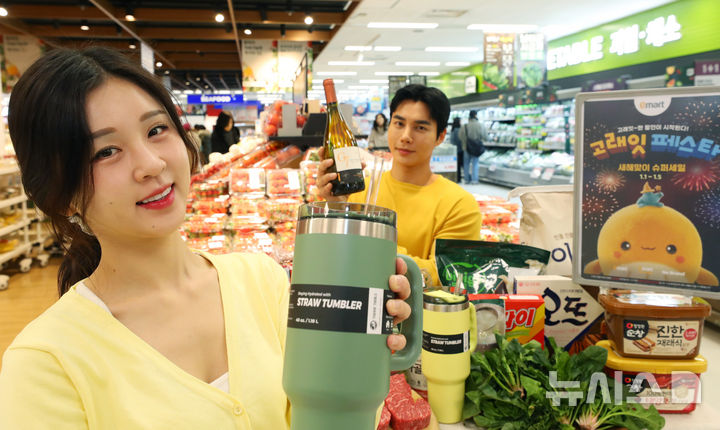 [서울=뉴시스] 김혜진 기자 = 27일 서울 용산구 이마트 용산점에서 모델들이 먹거리와 텀블러를 선보이고 있다. 이마트는 내년 1월 1일부터 5일까지 5일동안 새해 첫 할인행사 고래잇 페스타를 선보인다. 새해 첫 포문을 여는 고래잇 페스타는 가장 큰 할인 혜택을 모은 '고래잇템(고래잇+아이템)' 14종과 카테고리별 2개 이상 구매 시 50%를 할인한다. 2024.12.27. [email protected]