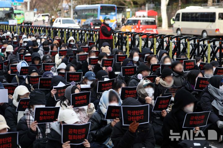 [서울=뉴시스] 김선웅 기자 = 동덕여대 학생들이 27일 서울 종로구 대학로 혜화역 인근에서 집회를 열고 학내 민주주의 실현, 남녀공학 전환 반대, 총장 직선제 도입 등을 촉구하고 있다. 2024.12.27. [email protected]