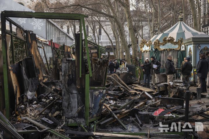 [뉴욕=AP/뉴시스] 27일(현지시각) 미국 뉴욕 브라이언트 공원의 '윈터 빌리지' 마켓 화재 현장에 경찰과 소방관들이 모여 있다. 현지 경찰은 크리스마스 마켓의 일종인 이 마켓에서 불이 나 매대 여러 곳이 소실되고 사상자는 없었다고 밝히며 화재 원인은 조사 중이라고 전했다. 2024.12.28.