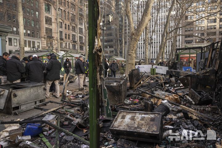 [뉴욕=AP/뉴시스] 27일(현지시각) 미국 뉴욕 브라이언트 공원의 '윈터 빌리지' 마켓 화재 현장에 경찰과 소방관들이 모여 있다. 현지 경찰은 크리스마스 마켓의 일종인 이 마켓에서 불이 나 매대 여러 곳이 소실되고 사상자는 없었다고 밝히며 화재 원인은 조사 중이라고 전했다. 2024.12.28.