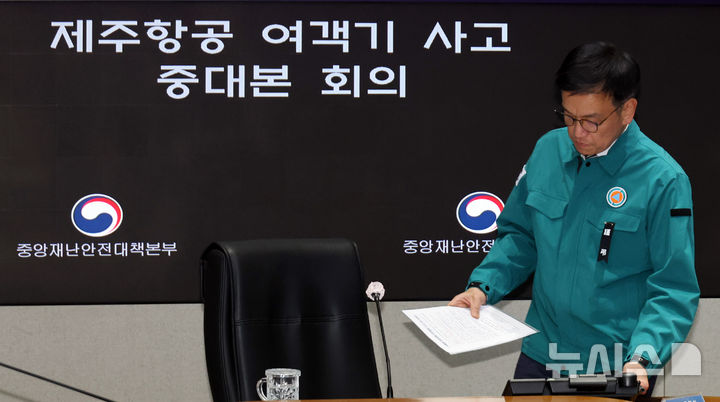 [서울=뉴시스] 최진석 기자 = 최상목 대통령 권한대행 부총리 겸 기획재정부 장관이 29일 서울 종로구 정부서울청사 중앙재난안전대책본부에서 열린 3차 제주항공 여객기 사고 중대본 회의에 입장하고 있다. (대통령실통신사진기자단) 2024.12.29. [email protected]