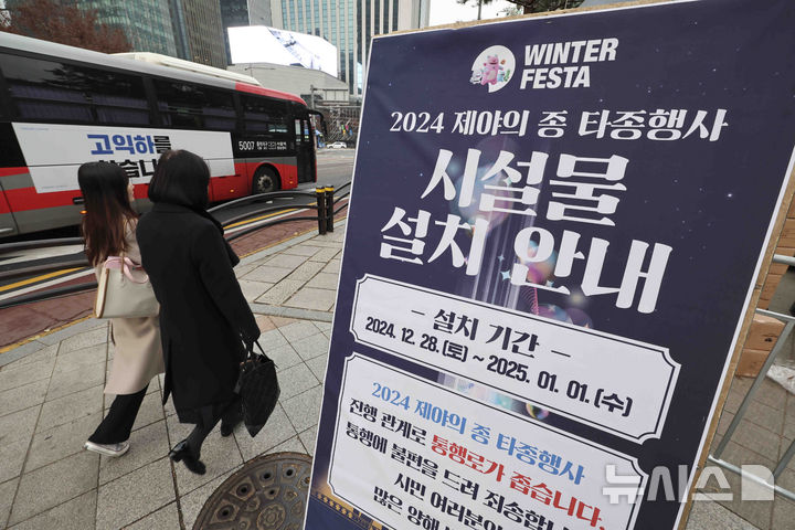 '제야의 종 타종 행사'는 공연과 퍼포먼스를 취소하고, 타종식을 중심으로 진행한다. 타종 순간 보신각 뒤 지름 30m의 태양이 떠오르는 '자정의 태양'을 보며 보신각에 모인 시민들이 함께 조의와 애도하는 시간도 가질 예정이다. 2024.12.30. [email protected]