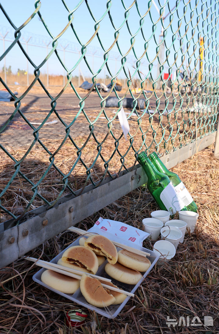 [무안=뉴시스] 이영환 기자 = 31일 오전 전남 무안국제공항 제주항공 여객기 충돌 사고 현장에 조문객들이 두고간 술과 빵이 놓여있다.2024.12.31. [email protected]