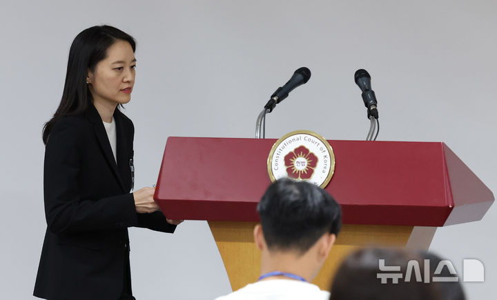 [서울=뉴시스] 추상철 기자 = 이진 헌법재판소 공보관이 31일 오후 서울 종로구 헌법재판소에서 윤석열 대통령 탄핵심판 사건 관련 브리핑을 위해 단상으로 향하고 있다. 2024.12.31. [email protected]