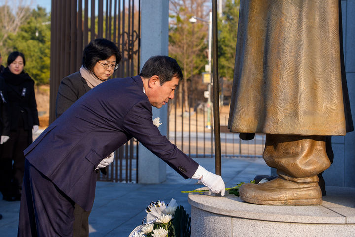 [증평=뉴시스] 이재영 충북 증평군수가 1일 증평군 도안면 연병호 항일역사공원에서 헌화하고 있다. (사진=증평군 제공) 2024.01.01. photo.newsis.com *재판매 및 DB 금지