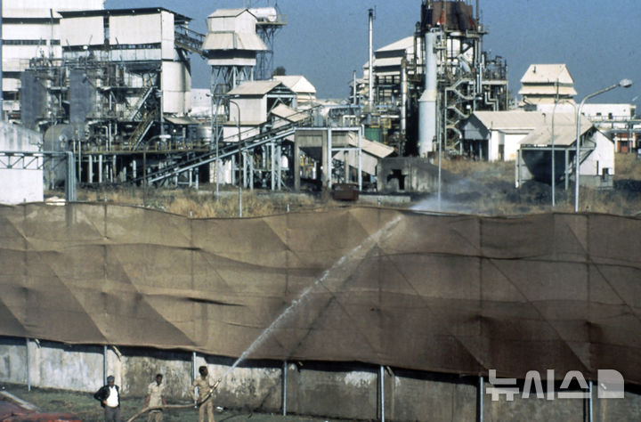 [보팔(인도)=AP/뉴시스]인도 보팔의 유니언 카바이드 공장에서 1984년 12월3일 소방관들이 위험한 연기가 퍼지는 것을 막기 위해 공장 경계에 설치된 캔버스 스크린을 적시기 위해 호스로 물을 뿌리고 있다. 인도가 1884년 12월 수천명의 목숨을 앗아간 보팔 가스누출 사고를 일으킨 보팔 유니언 카바이드 화학공장의 유독성 폐기물 수백t을 사고 발생 40년 만에 제거했다고 BBC가 2일 보도했다. 2025.01.02.