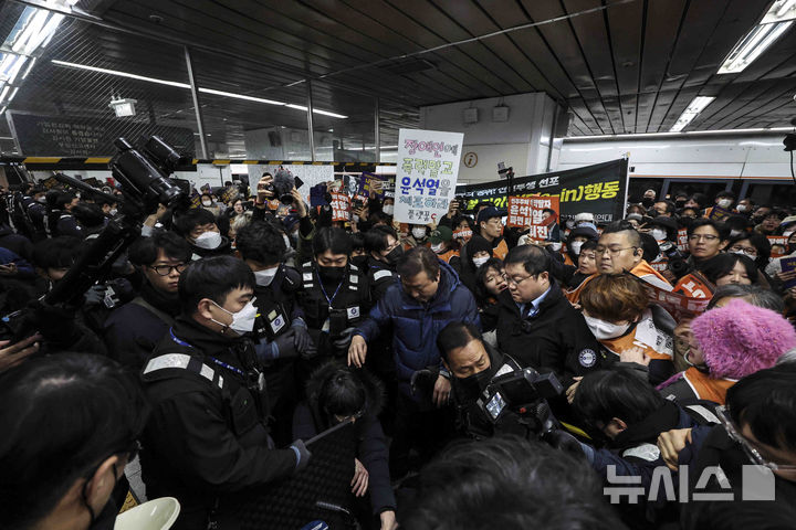 [서울=뉴시스] 김근수 기자 = 박경석 전국장애인차별철폐연대 공동대표와 회원들이 2일 오전 서울 종로구 서울지하철 3호선 안국역에서 새해 출근길 선전전을 하고 있다. 2025.01.02. [email protected]