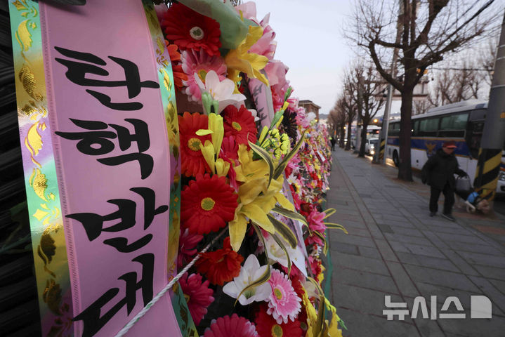 [서울=뉴시스] 김근수 기자 = 정계선, 조한창 헌법재판관 임명에 따라 헌법재판소가 '8인 체제’로 이뤄진 가운데 2일 오전 서울 종로구 헌법재판소 앞에 화환이 놓여 있다. 2025.01.02. [email protected]