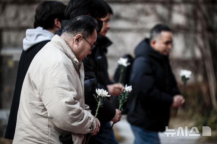 [서울=뉴시스] 정병혁 기자 = 2일 서울 중구 서울시청 앞에 마련된 제주항공 여객기 사고 희생자 합동분향소에서 조문객들이 헌화하고 있다. 2025.01.02. [email protected]