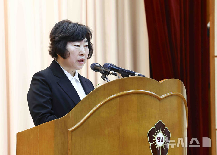 [서울=뉴시스] 김근수 기자 = 정계선 헌법재판관이 2일 오전 서울 종로구 헌법재판소에서 열린 조한창, 정계선 헌법재판관 취임식에서 취임사를 하고 있다. 2025.01.02. [email protected]