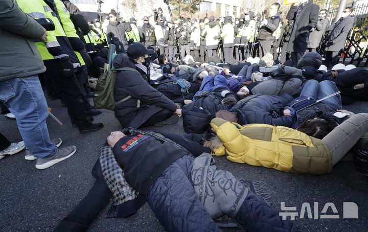 [서울=뉴시스] 최동준 기자 = 2일 서울 용산구 한남동 대통령 관저 앞에서 윤석열 대통령 지지자들이 탄핵을 반대하며 드러누워 항의하고 있다. 2025.01.02. [email protected]