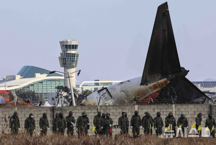 [무안=뉴시스] 김근수 기자 = 3일 전남 무안국제공항 제주항공 여객기 참사 현장에 제주항공 여객기 뒤로 관제탑이 보이고 있다.  2025.01.03. [email protected]
