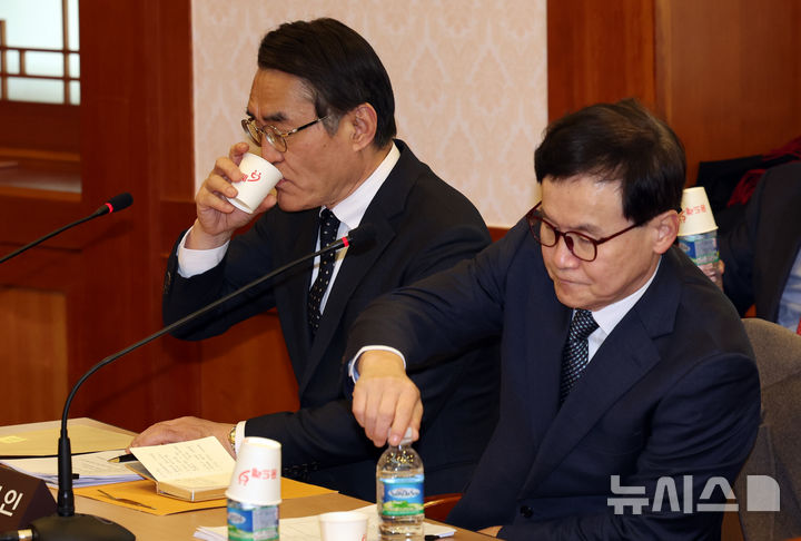 [서울=뉴시스] 이영환 기자 = 윤석열 대통령측 변호인단인 배보윤(왼쪽), 배진한 변호사가 3일 오후 서울 종로구 헌법재판소에서 열린 윤석열 대통령 탄핵심판 2차 변론준비기일에 참석해 물을 마시고 있다. 2025.01.03. [email protected]