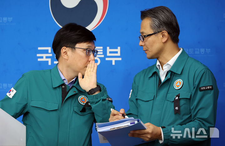 [세종=뉴시스] 강종민 기자 = 주종완 국토교통부 항공정책실장이 3일 정부세종청사에서 무안국제공항 제주항공 여객기 참사 관련 브리핑에서 유경수 국토교통부 항공안전정책관과 답변내용을 논의하고 있다. 2025.01.03. [email protected]